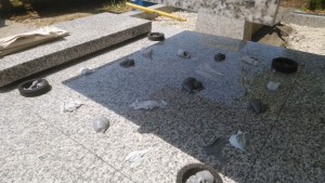ステンレスの金具で固定します。全部で10カ所固定。石同士だけではなく、下の基礎コンクリートとも固定します。