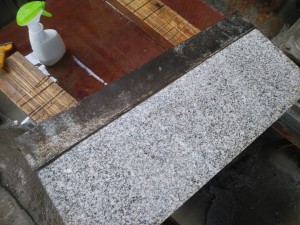 更に、石の裏面と基礎コンクリートとをしっかりと接着できるように、モルタル接着剤というものを塗って、強固に固まるように。。。接着剤が乾燥するまで、待っております。