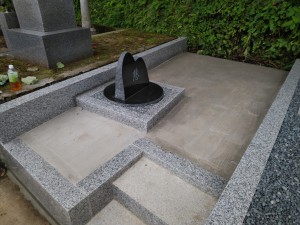 奥のお墓は新しく水鉢と花立が一緒になった石を設置して、納骨できるように作り直しました。右のお墓は地面に突き刺すのはコンクリートなので、無理です。板石を新しく設置して、その上に置くように加工し直しました。ステンレスの筒が入るように穴の大きさも大きく。