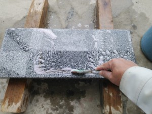 石材専用洗剤で落としていきます。このレベルになると、説明書をしっかりと確認して落とさないと、取り返しがつかないことになることも。。。
