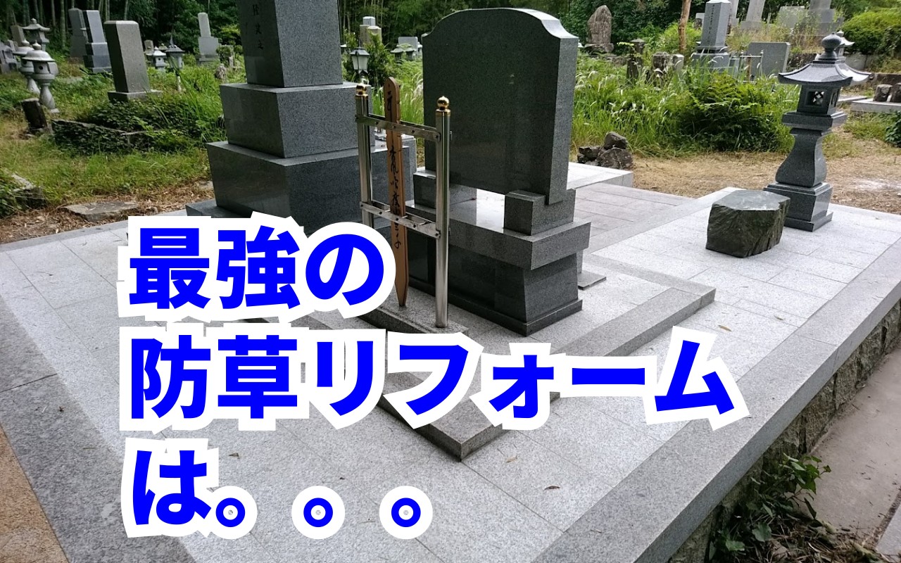 このお墓は下地がコンクリートのベタ基礎(全面にコンクリート施工)。その上に化粧玉石を入れているんですが、長い年月で中に土が入り込んで、笹の葉が腐葉土と化し、それを栄養に草が生えてきて、どうしようもないお墓になってしまっています。