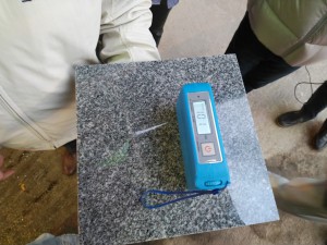 国産の最高品質の「天山石」を最もレベルの高い研磨加工で磨いた板石です。光沢計が「101」となっていますね。通常、100を超えることはないはずなんですが。。。黒みかげ石なら、素晴らしい磨きをしたら稀に100になるようなんですが、このグレー系のみかげ石でこの数値はあり得ない数値ですね。