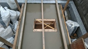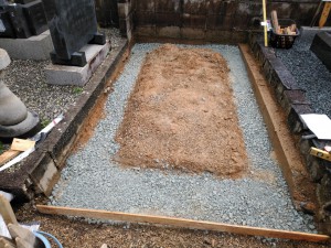 まず、外柵の部分の基礎コンクリートをするために、地面を掘っております。今回は小さめなお墓のため、通常とは多少違う基礎の仕方です。