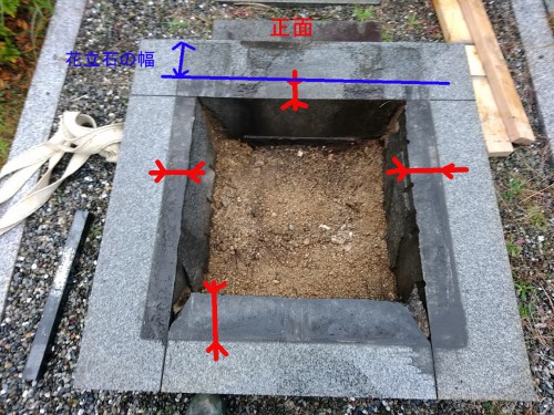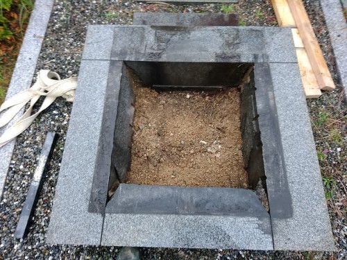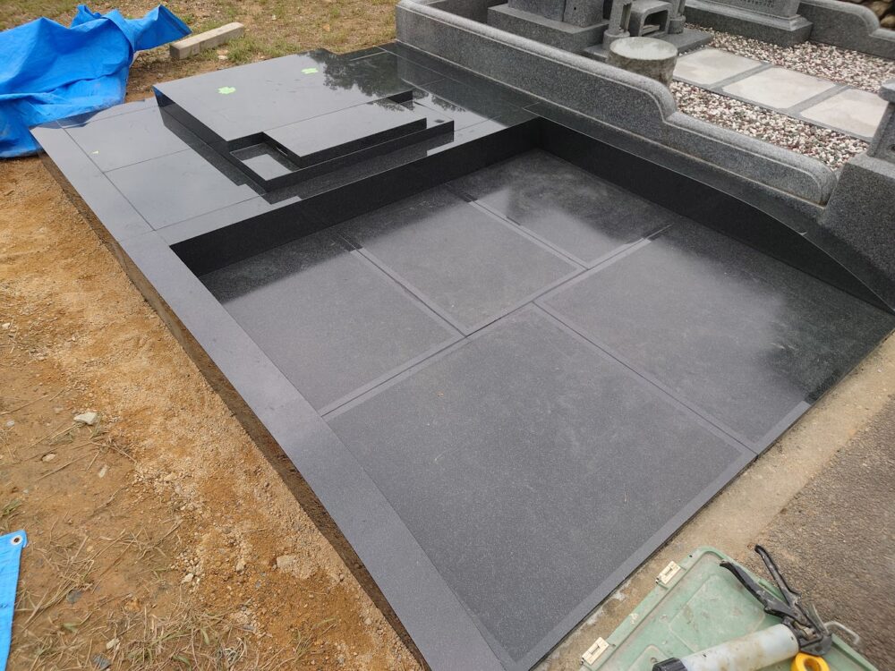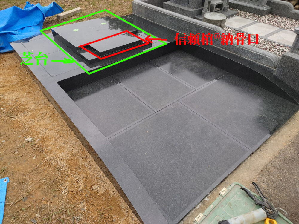 こちらは以前、信頼棺構造のお墓を建てた時の途中写真です。まだ竿石が設置されていないので、信頼棺の納骨口が分かりやすい画像です。