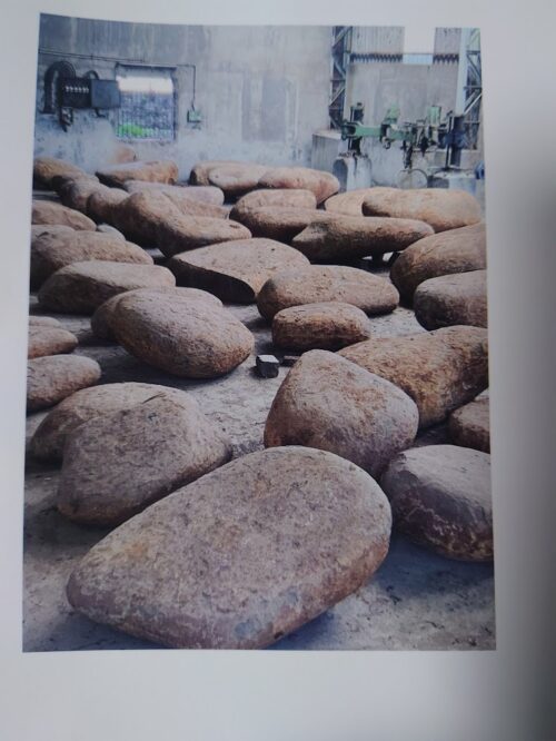 この石は玉石と言って、丸い形状の玉のような形で採掘され、その大小のある玉石をカット、磨いてお墓の石を作るのですが、お墓に使われる石は意外と玉石が多いのです。