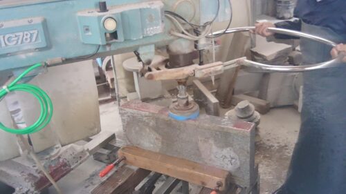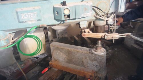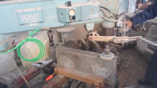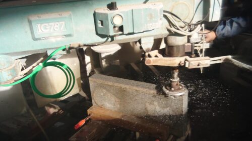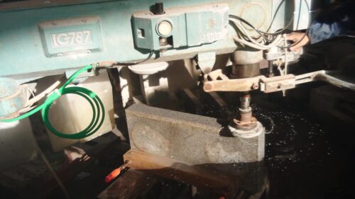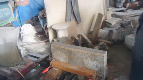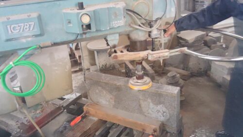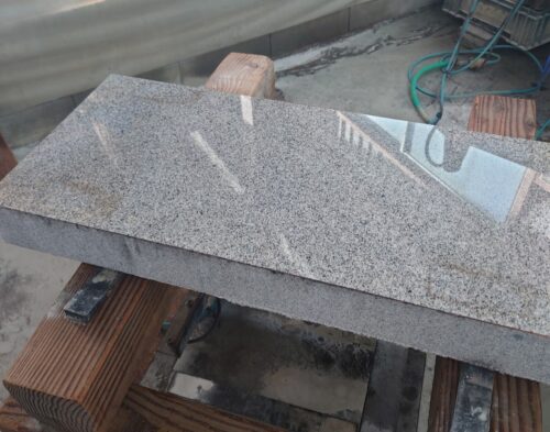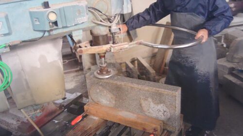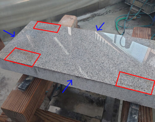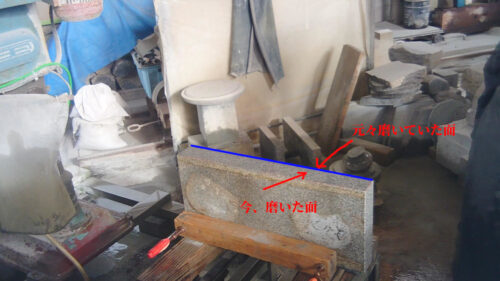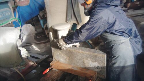 上の写真、同じ作業のように見えますが、すべて違う砥石を使っています。通常7種類の番手の違う、という表現を使いますが、粒子の違う砥石を使って磨いていきます。石、特にみかげ石はこのように、丁寧に地道に研磨作業をしないと、光沢はでません。