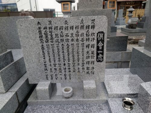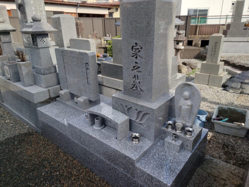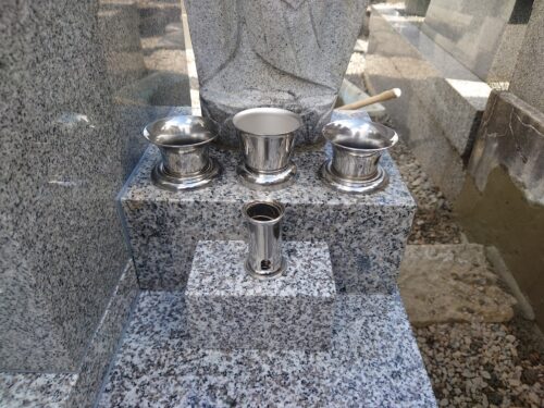 向かって右のお地蔵様。花立の筒が2個、その真ん中が水呑みといって、お水を入れるコップ。手前が線香を立てる線香立です。こちらの宗派は浄土真宗なので、寝かせてお供えするのが普通かもしれませんが、スペース上、この普通のタイプを設置させていただきました。