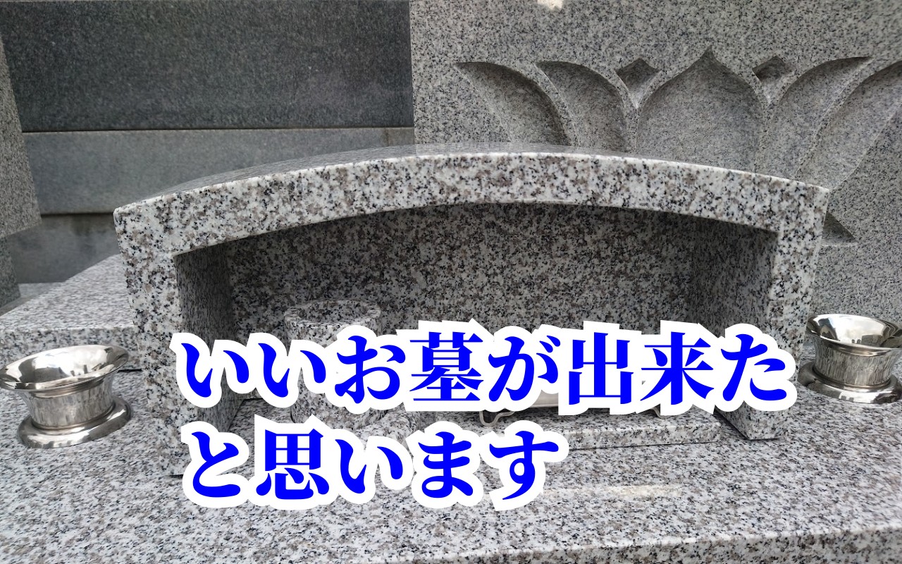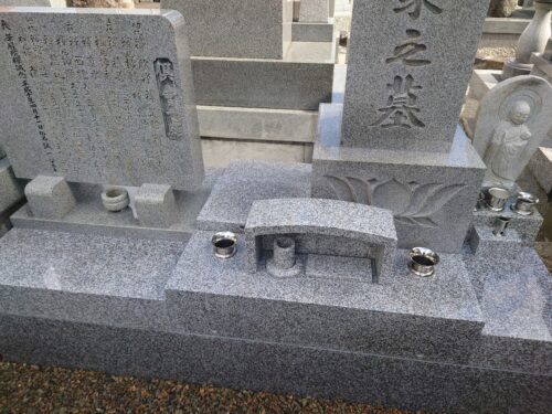 地震に強いお墓であり、雨漏りしないお墓、信頼棺のお墓でもあり、構造を変えたことで、手前がすっきりして、お供え物、物置台、腰かけなどに代用できるスペースも用意できました。