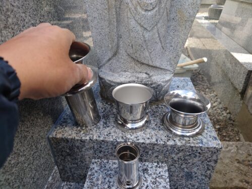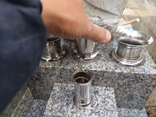 左のお墓本体同様、抜けるようになっている花立の筒。両方とも抜けます。
