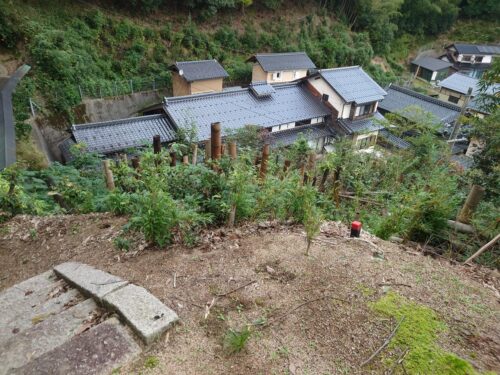 小高い山の上にある墓地から眺めた民家。こんな高い場所まで石の階段があるのが、凄い。(兵庫県豊岡市にて)