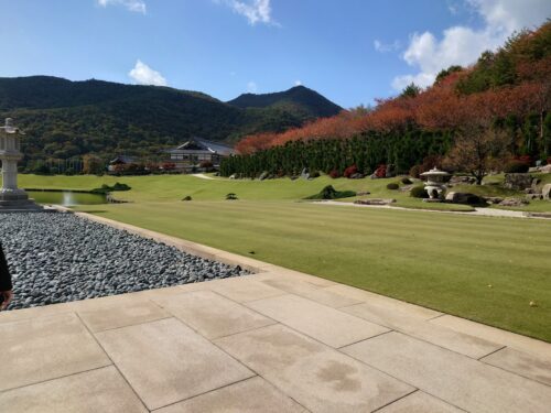 先日行った兵庫県にある新興宗教の本山。石と緑と芝生と。作られた景色だと言え、心休まる風景です。ゴルフもできそう。
