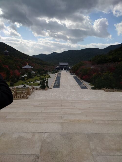 本堂から山門を眺めて。広大な眺めです。これほどの広さの空間が石で埋め尽くされているのが、信じがたい。