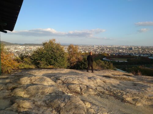 竜山石の頂上から高砂の町並みを眺める人。危ないですよ。気を付けて。でも、素晴らしい眺望。