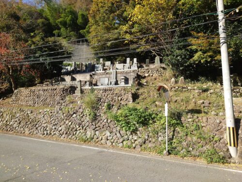 豊岡市内にあるお墓の風景。玄武岩の石積みの上に墓地があります。豊岡では見慣れた風景。