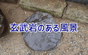 そこで、私が玄武岩を秘かに集めています。このあたりの家を解体した現場には、おそらくたいがい玄武岩が出てきます。そこで、余った玄武岩を譲ってもらったり、お墓の石垣等に使われている玄武岩を分けてもらったり、いろいろなルートで玄武岩を集めています。こちらは比較的大きめの玄武岩の石。