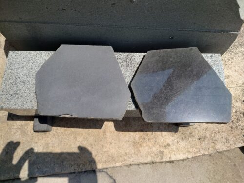 右が研磨仕上げを施してあります。ここまで光沢を出さないと、玄武岩の美しい光沢は見えません。左は800番手まで研磨で仕上げた「マット仕上げ」の玄武岩。いずれも表札、小さめの看板に使える設置型玄武岩プレート。