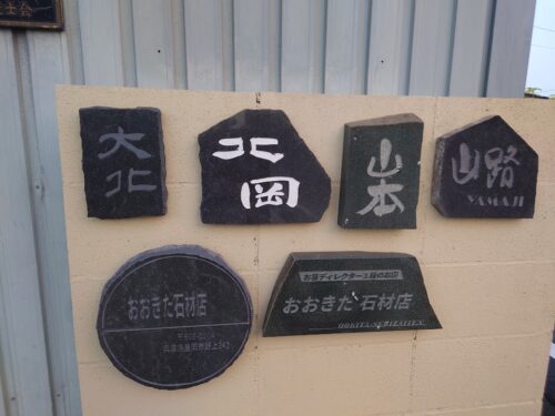 上の大北、北岡、山路、そして、下の段、丸い方のおおきた石材店の4枚は玄武岩製の表札です。上の山本、下の横長のおおきた石材店は地元、豊岡市で採掘された名もなき石です。