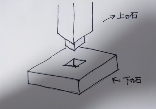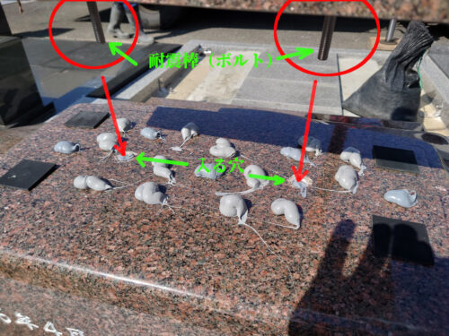 耐震棒(ボルト)を下の石に挿入する際の画像です。