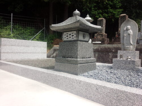 この灯ろうも、敢えて、和型に使用する笠付の墓前角置き灯ろうを少し工夫して、このデザイン墓にも合う雰囲気に変更しました。