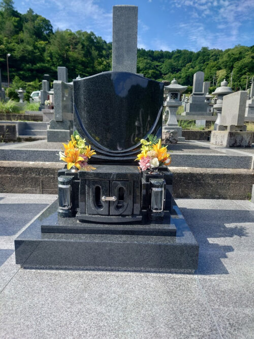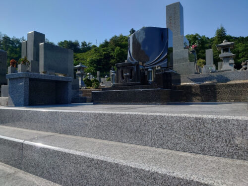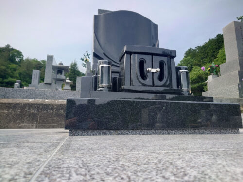 秋の澄んだ空を表したデザイン墓。明空。意外とオーソドックスですが、正面の香炉が扉内に納められていて、それを留める留め金がいい感じに目立ちます。