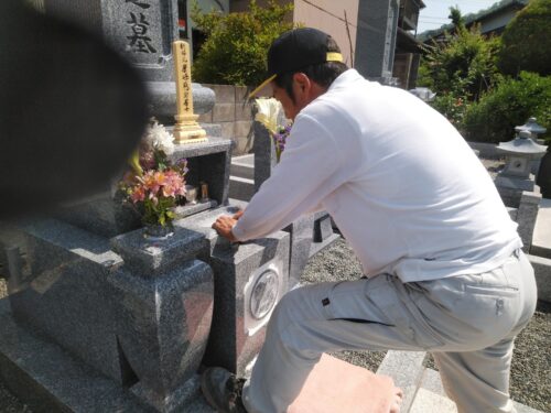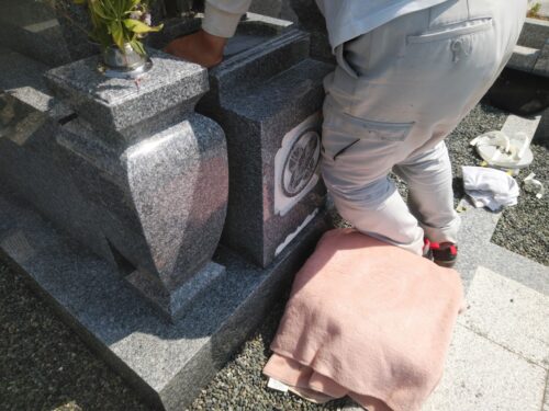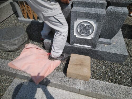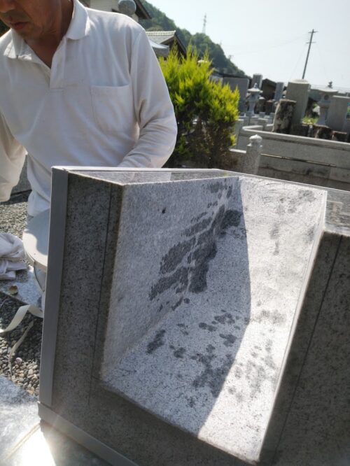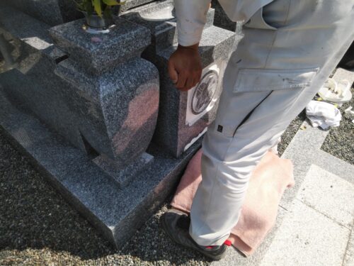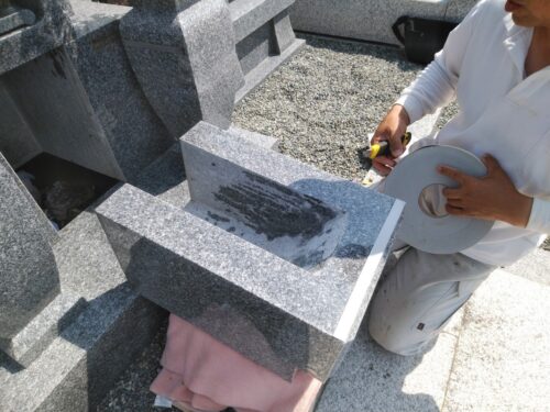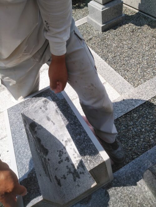 手前に置いていた台の上に倒し、今回は目地テープ。納骨時はこのタイミングで施主様に納骨していただきます。もちろん場合によっては、私自身が納骨を代行させていただきます。