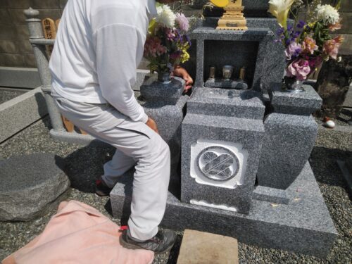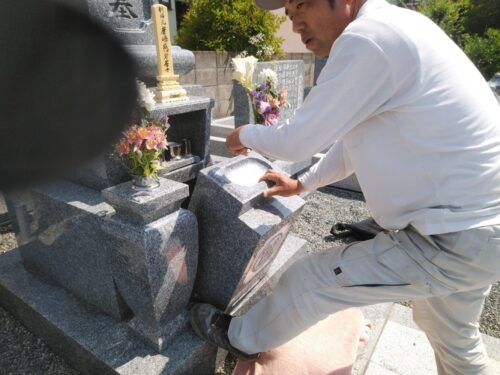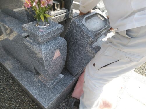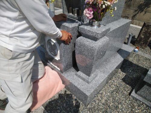ちなみに、このお墓は関西では普通の水鉢の奥にカロート(納骨スペース)のある、和型のお墓です。関東のお墓はまた構造が異なります。信頼棺のお墓も全く納骨口の構造が異なりますので、ご了承ください。