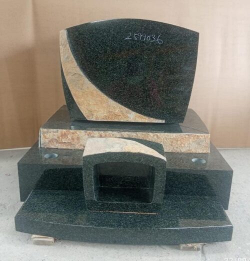 中でも、天竺シリーズのお墓は、石の皮目(かわめ)と言って、自然石でもあるこの石は採掘された時は表面は、色が変わり、独特の茶系の色目をしており、カットして中を磨くとその深い緑色が姿を現します。この色のコントラストがお墓の最近の人気の一つとなっています。