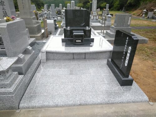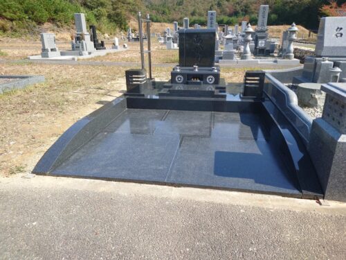 こちらは、東霊苑に最初に建てたバリアフリータイプのお墓。この後、このバリアフリータイプのお墓が多く建ちました。この豊岡市営霊苑は奥行きが長く、間口が狭いので、このバリアフリータイプか、普通の階段タイプしか選択肢がない気がします。