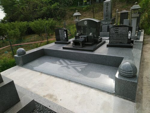 こちらも、西霊苑のお墓です。最初に建てたお墓とほぼ同じ形状の外柵です。こちらも上から下まで同じ石で建てた「共石」のお墓です。(上から下まで同じ石で制作したお墓。一体感があり、高級に見える)