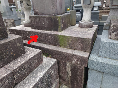 こちらの矢印のお墓がそのお墓の後ろ面。納骨口らしき部分はなさそう。この下の隠れている部分にあるとしても、