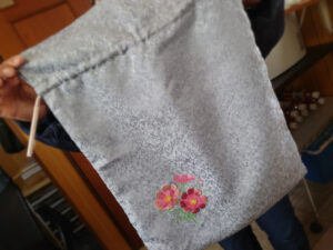 京都の絹織物を使い、京縫職人の伝統工芸士でもある安部さんが一点一点、手縫いで丁寧に仕上げた京刺繍の納骨袋です。