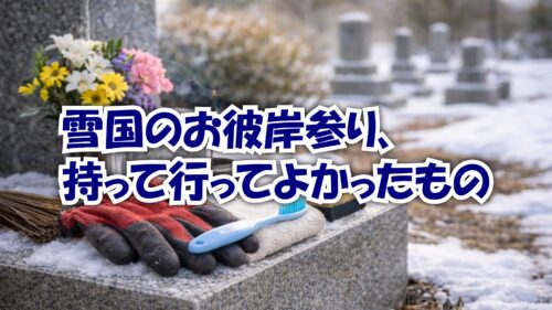 春のお彼岸。雪国では、「ようやく行けるかな」と思いながら迎える方も多いと思います。ただ、雪が解け始めた時期の墓地は、冬とはまた違った注意が必要です。 今回は、「実際に持って行ってよかった」「あると安心だった」そんな持ち物を中心にご紹介しま... -