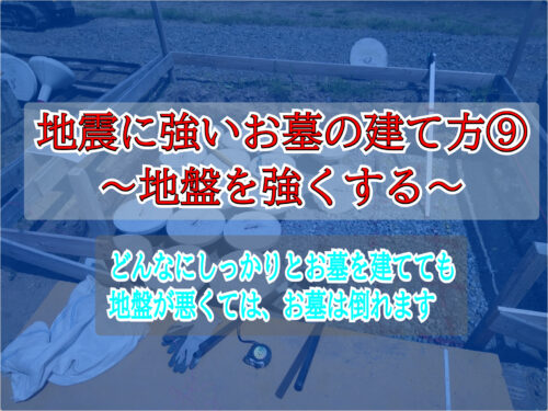 基礎工事ではないですよ。 大島石のお墓が乗る墓地の基礎工事。その前に、基礎が乗る地盤を改良します。 あんまり詳しく写真を掲載できないのですが、お墓が乗る地盤が完成。 この「トップベース工法」のコマが墓地全面に敷いてあります。 それにしても、... -