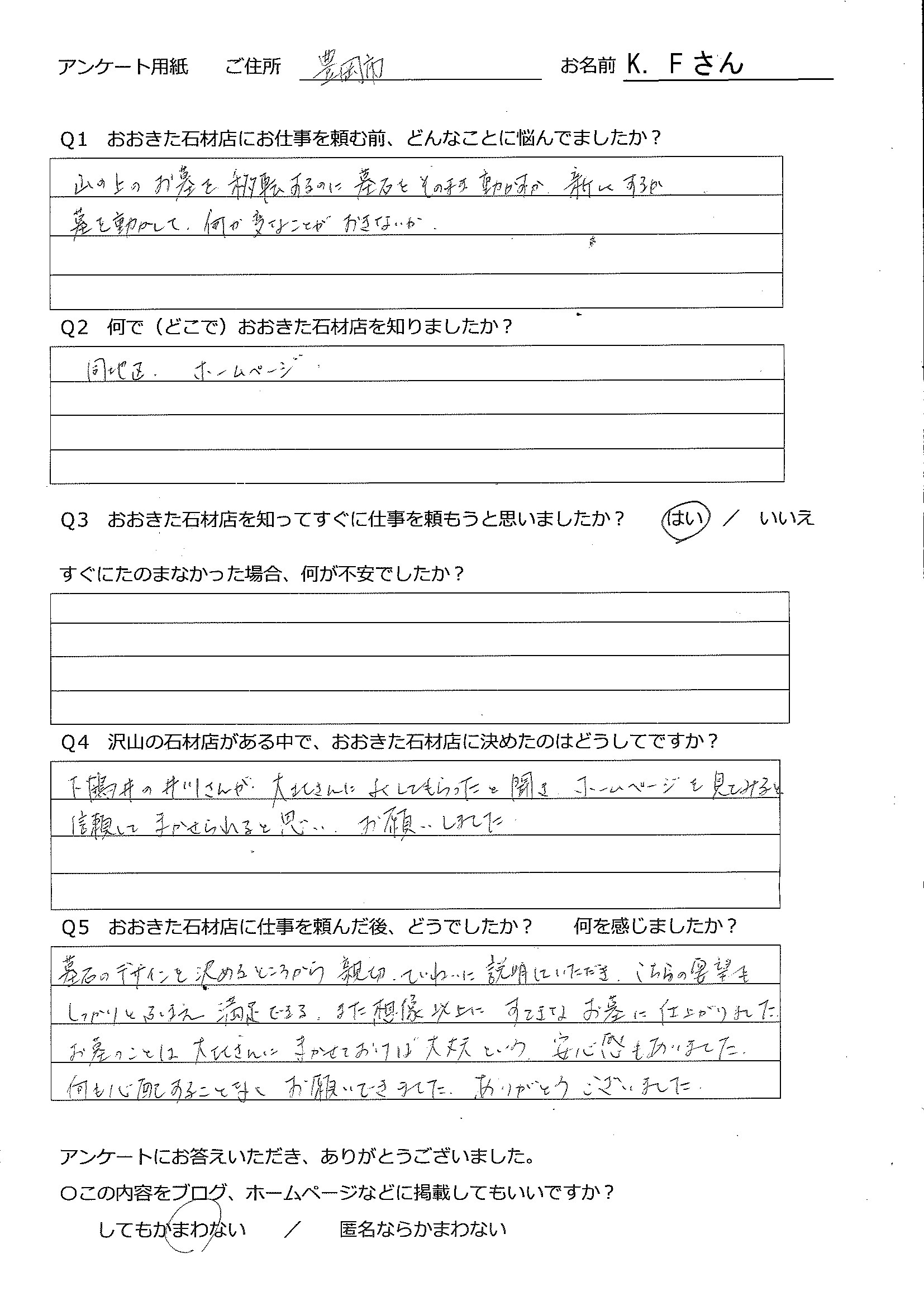 信頼棺構造、基礎石構造、全面石張施工、と初めてづくしのお墓となりました。