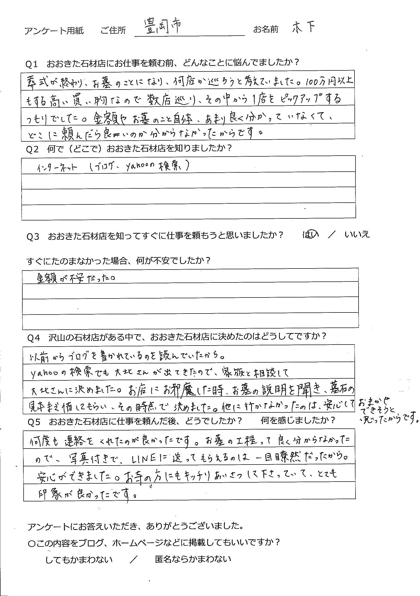 木下様、大変お世話になりました。城崎マリンワールドのすぐ隣の墓地という非常に交通量が多いはずの場所だったのですが、予想外に車がほとんどおらず、新型コロナウィルスの影響ではありますが、大変助かったお墓工事でした。